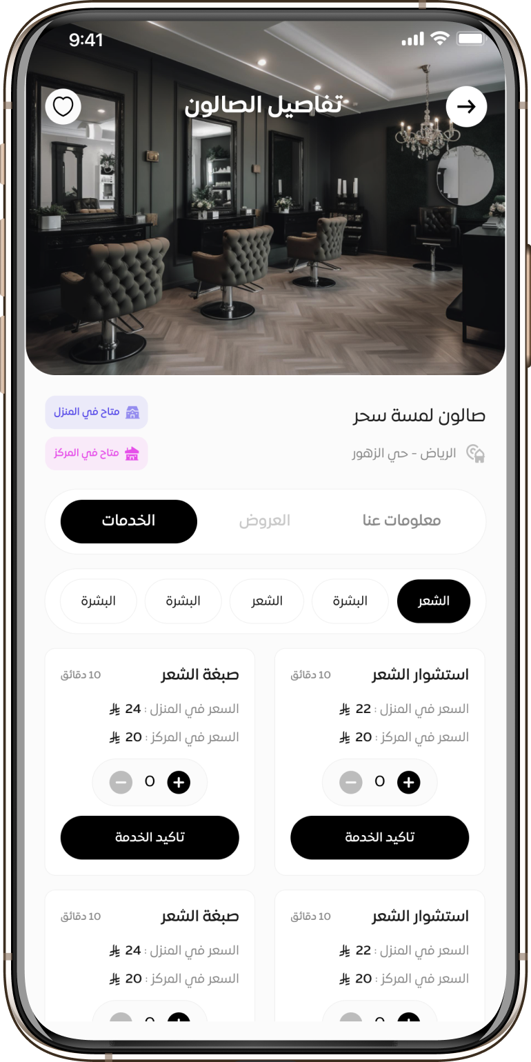استعرضي أفضل المشاغل ومراكز السبا، اختاري الخدمة المناسبة، وحددي موعدك خلال دقائق بكل سهولة وأمان.